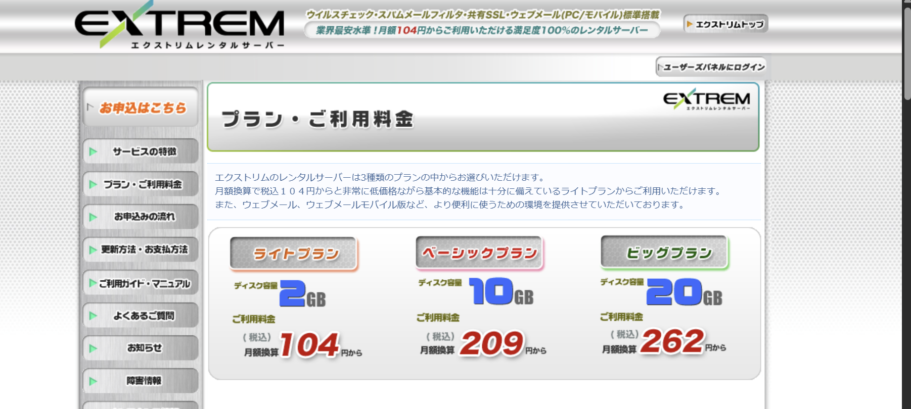 エクストリムレンタルサーバーの最大の魅力は、その安さです。最も手軽な「ライトプラン(容量2GB)」であれば、月額104円(税込・長期契約時)から利用可能です。初期費用として別途1,100円程度かかりますが、ランニングコストはお小遣い感覚で維持できるため、失敗を恐れずに「自分だけのWebスペース」を持つことができます。 上位プランでも容量は10GB〜20GBと、月額1,000円クラスの他社サーバーに比べれば控えめですが、高画質の動画を大量に扱わない限り、個人のブログや小規模なコーポレートサイト、サークル活動のページとしては十分なサイズです。